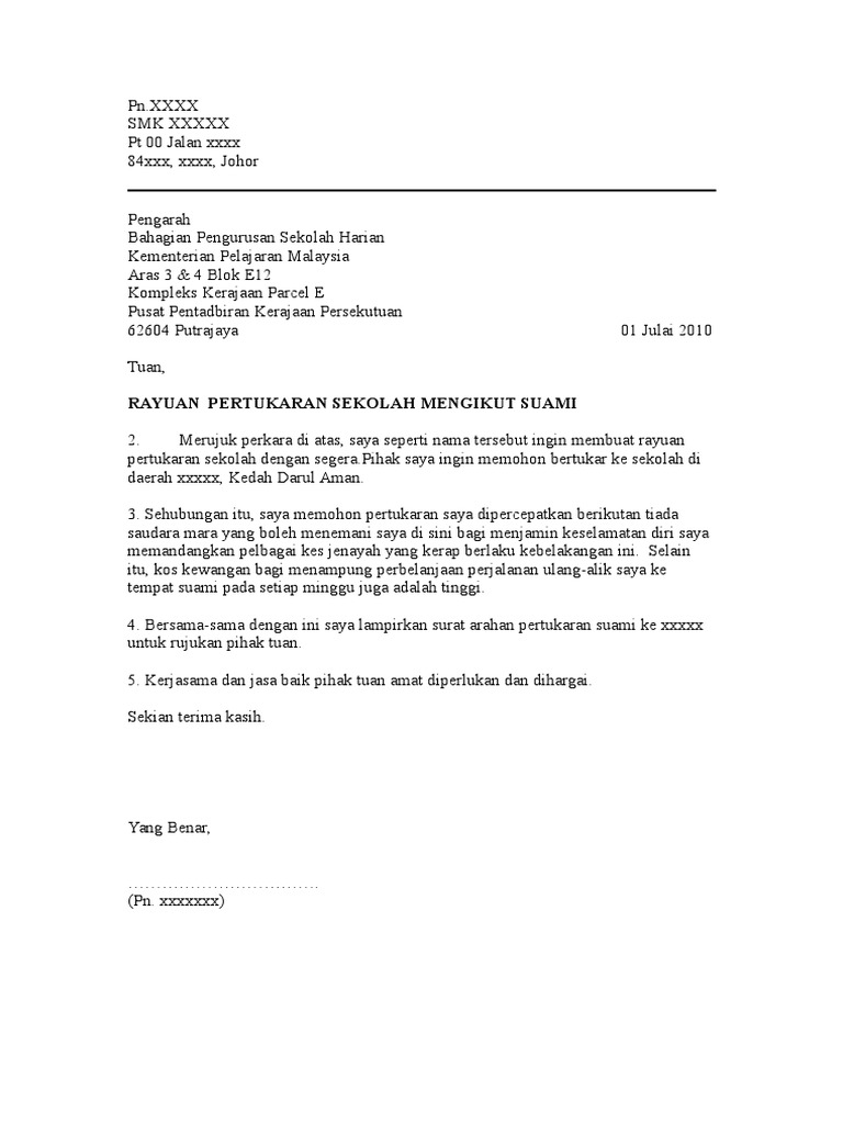Contoh Surat Rayuan An Pertukaran Mengikut Suami Pdf