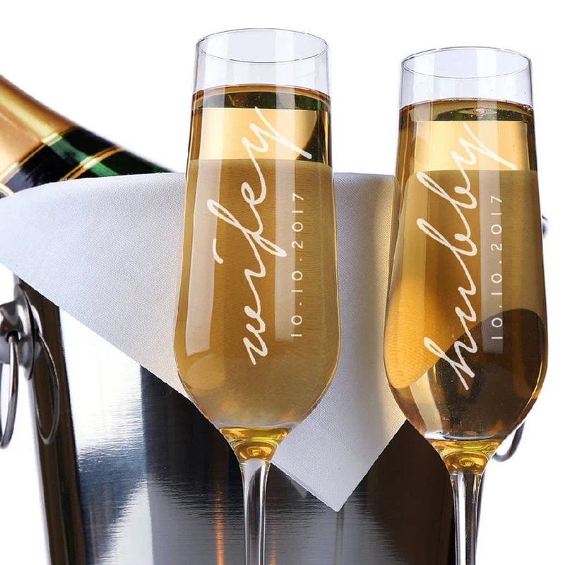 . 7200 30 off FREE. Great to use at bridal showers bachelorette parties and weddings. Personalized Wedding Champagne Flutes 8 oz - With Engraved Wooden Gift Box For Couples-Mr and Mrs Wedding Toasting Flutes.